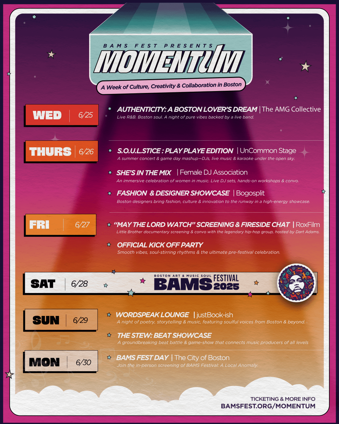 About BAMS Fest: BAMS Fest is a nonprofit organization that breaks down racial and social barriers to arts, music, and culture across Greater Boston. Through edutainment (education + entertainment), strategic partnerships and cultural programming, we celebrate and support both artists and audiences, with an emphasis on Black and Brown voices, perspectives, and artistry.
